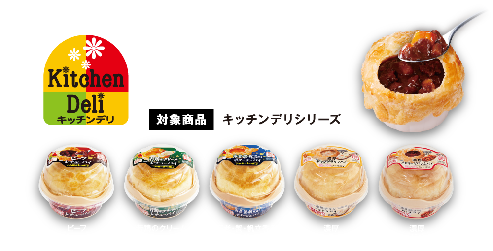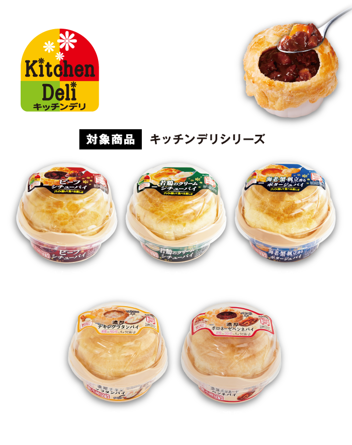 キッチンデリシリーズ(ビーフシチューパイ、若鶏のクリームシチューパイ、海老・蟹・帆立香るポタージュパイ、濃厚チキングラタンパイ、濃厚ボロネーゼペンネパイ)